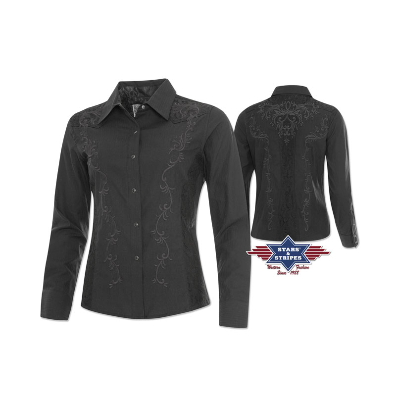 Blusa jacquard manica lunga con rifiniture in pizzo e ricamo. Rifiniture in raso sulla scollatura interna e bottoni automatici. 55% cotone e 45% poliestere.