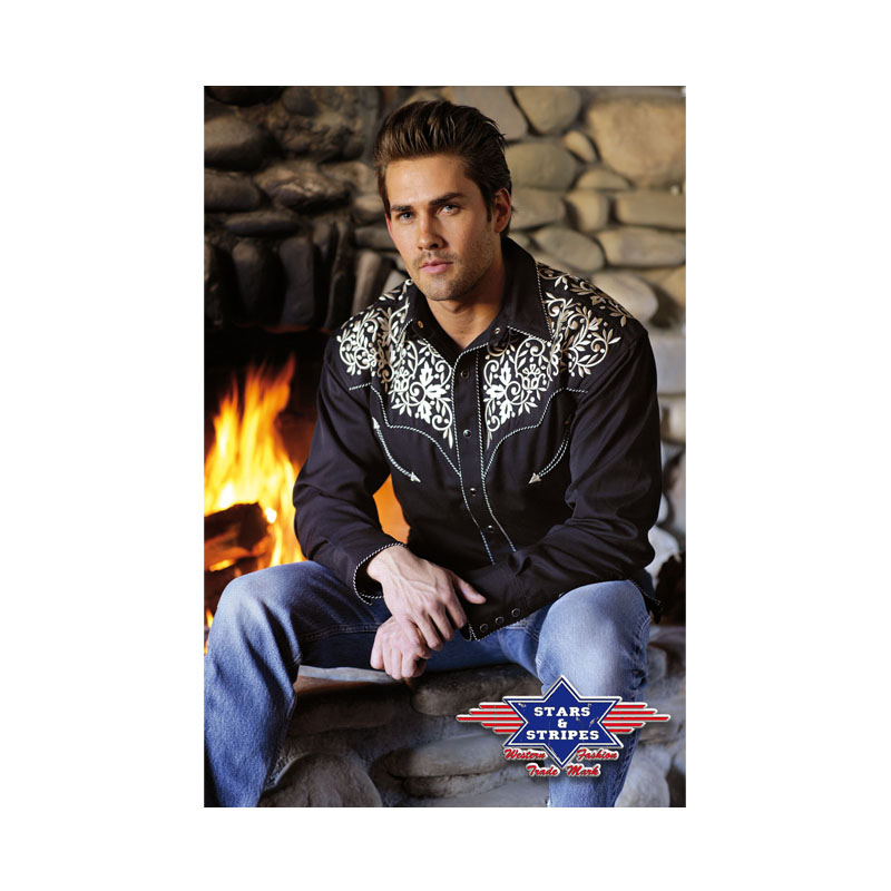 Camicia uomo occidentale con splendidi ricami sul petto e sulla schiena. Piping e polsini in due colori abbinati a tre bottoni. 65% poliestere e 35% viscosa.