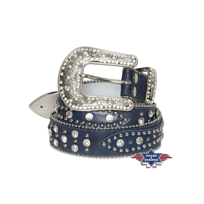 Cintura western con fibbia intercambiabile a tre vie. Lavorazione di alta qualità con strass scintillanti e borchie, realizzati in pelle di vacchetta spaccata.