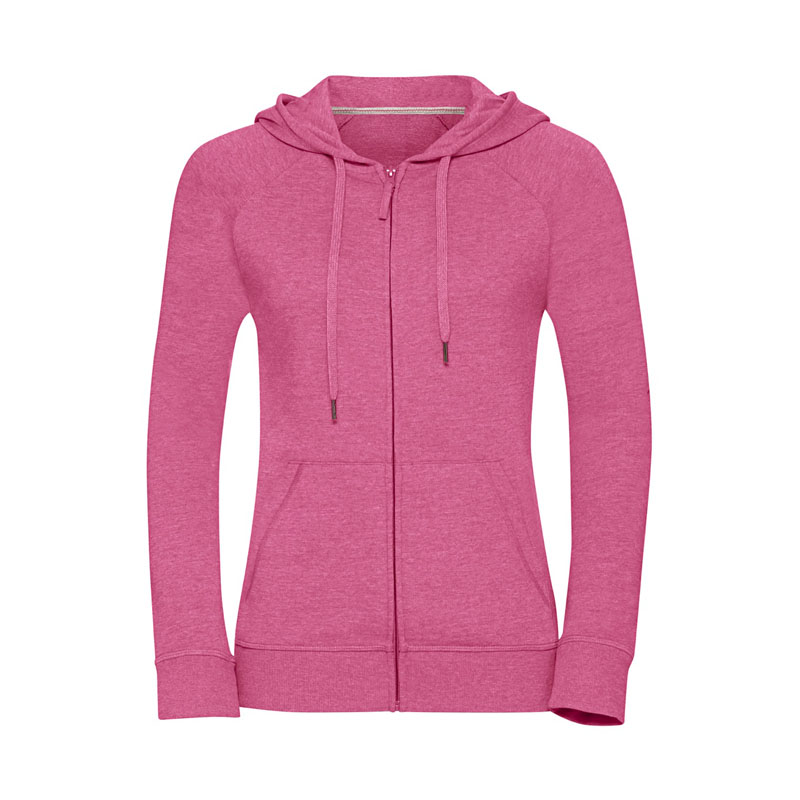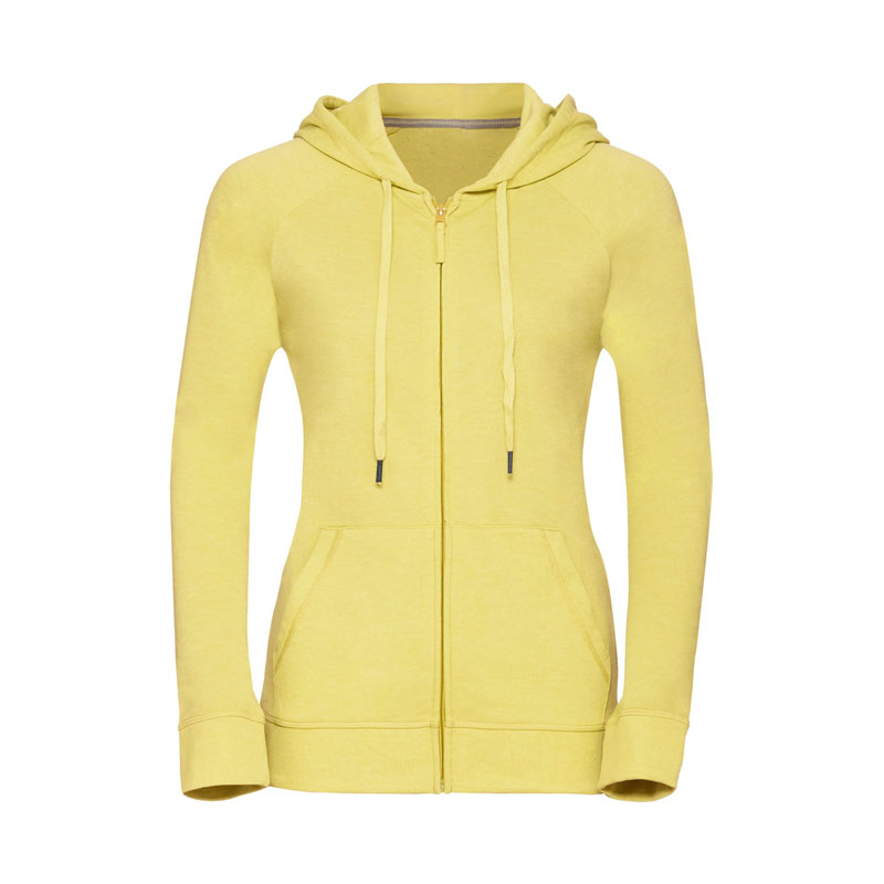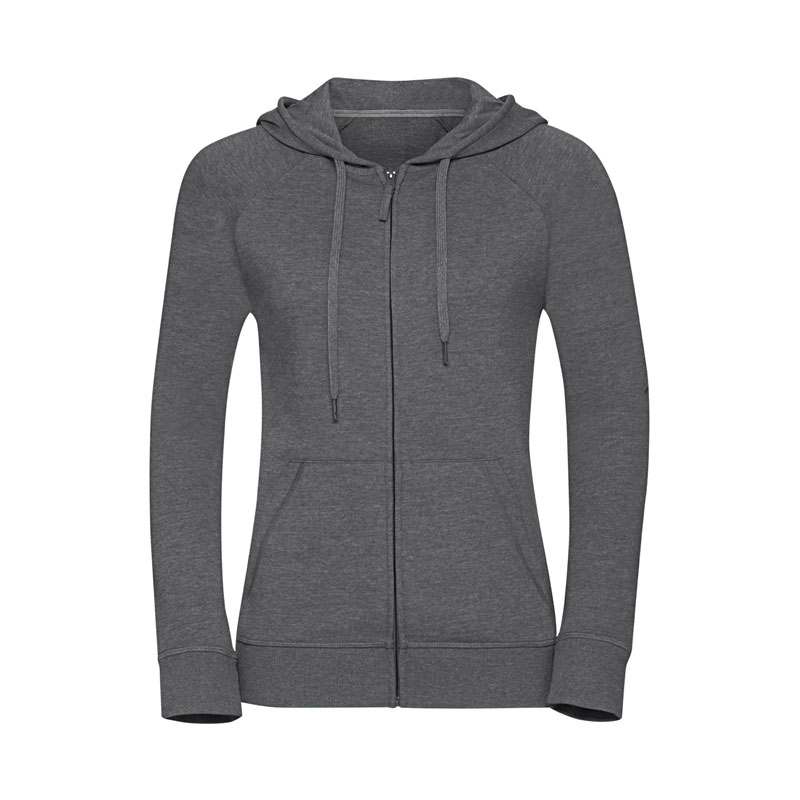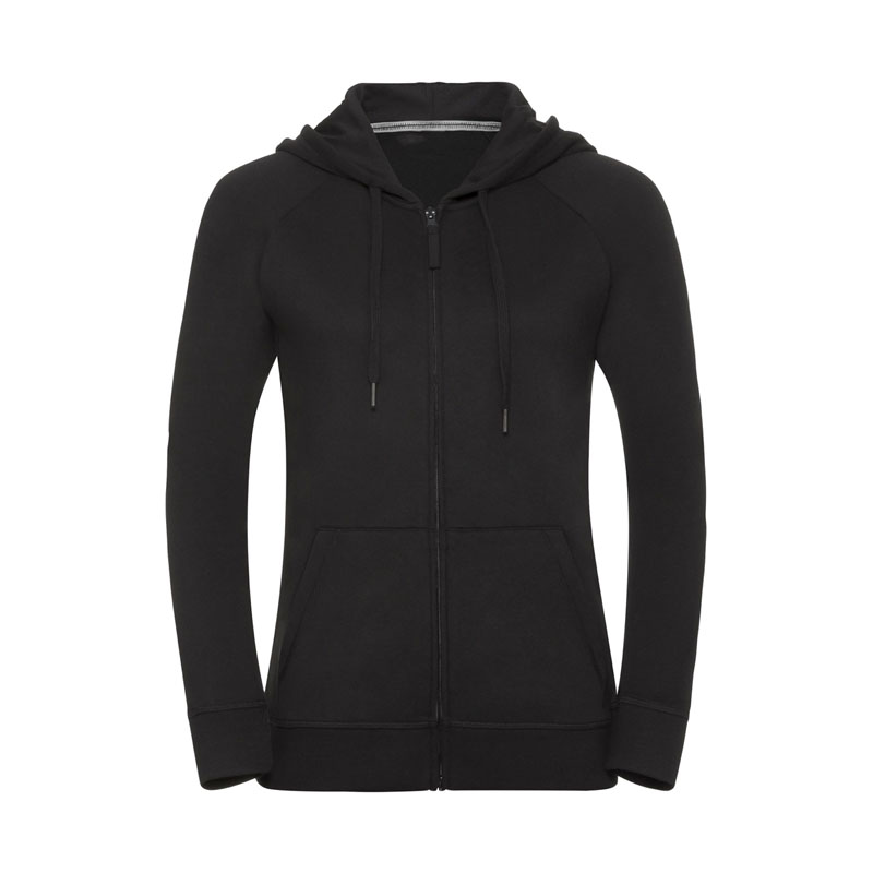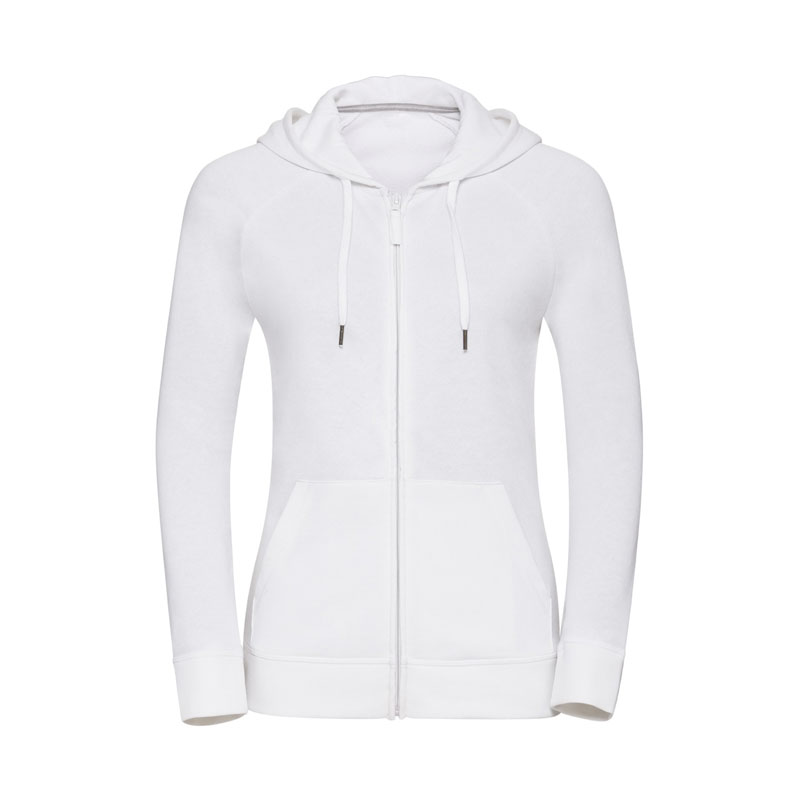 Felpa donna taglio slim e contemporaneo, nastrino a contrasto sul collo con dettaglio dell’impuntura, cuciture coperte su polsini e cintura, etichetta posteriore adesiva rimovibile, cappuccio foderato in jersey con coulisse con cucitura coperta, cordino piatto in tinta con estremità in metallo, chiusura con cerniera intera con lingiuetta del tirante in jersey, tasca per Smartphone nascosta, tasca a marsupio, tessuto in Franch Terry, 65% poliestere e 35% cotone pettinato ring spun, 250 gr/m².