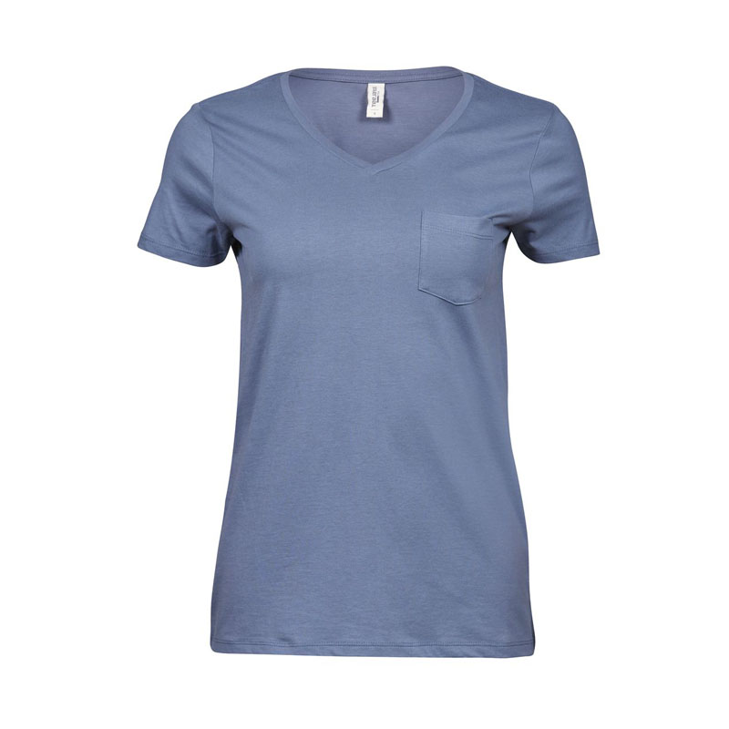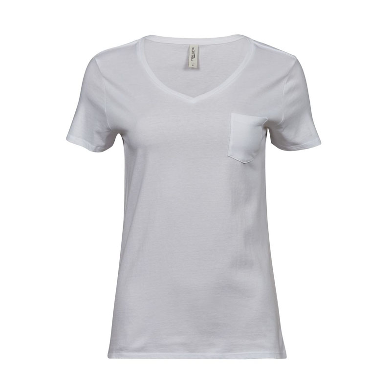 T-shirt a manica corta con tasca sul petto a sinistra e profondo scollo a V, vestibilità alla moda, tessuto in fibra di cotone di alta qualità, leggermente attillata su spalle e maniche, vestibilità comoda sul busto, cuciture doppie, nastrino di rinforzo da spalla a spalla, trattamento agli enzimi che dona al tessuto un tocco morbido, taglio femminile, 100% cotone single jersey, 160 gr/m².